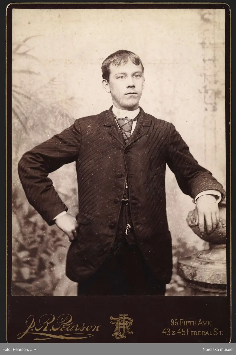 Emigration. Svenskar i Amerika. Porträtt av ung svenskamerikan tagen hos fotoateljen J.R. Pearsson, 96 Fifth Ave. 43&45 Federal St. Allegheny City, Philadelphia. USA.