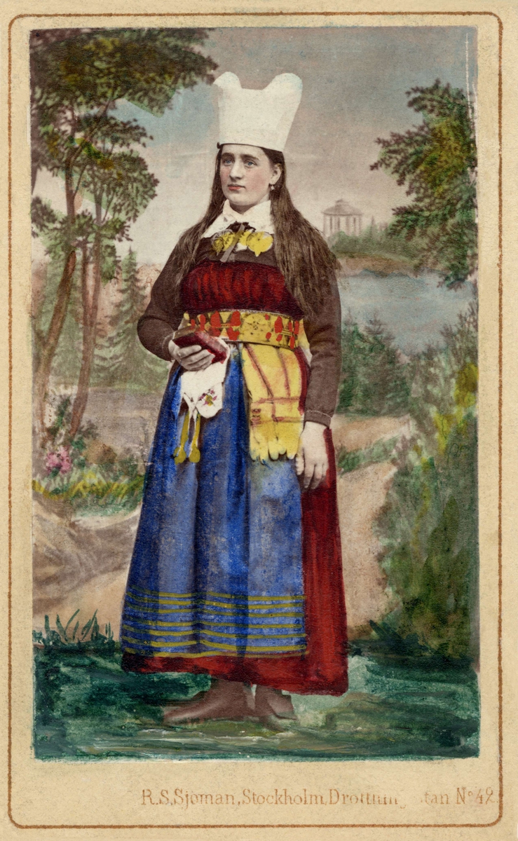 Handkolorerat fotografi, på en dam i sockendräkt