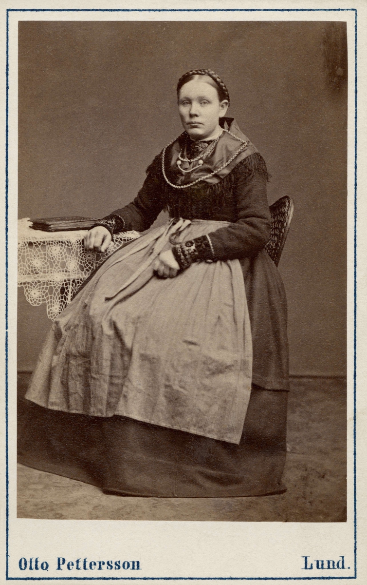 Kvinna sitter vid ett bord, poserar i en folkdräkt