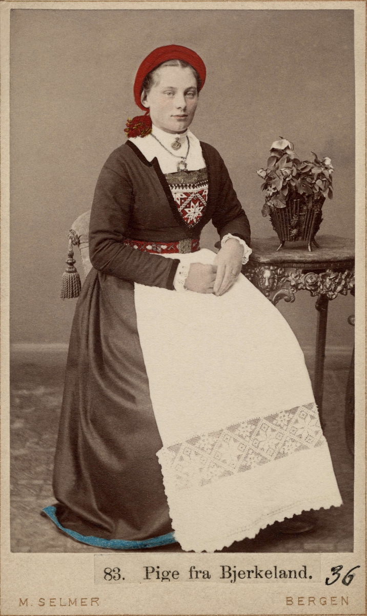 Pige fra Bjerkeland." En ung flicka sitter klädd i en dräkt från Bjerkeland, Norge