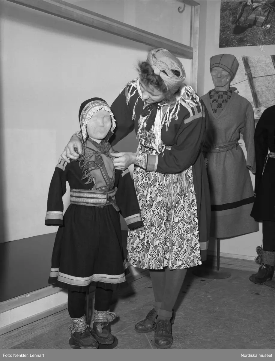 Nordiska museet. Lapska avdelningen. Skådesamlingens nymontering 1947. Dräkt- och föremålsmontering. Valv 4. Ellen Huuva.