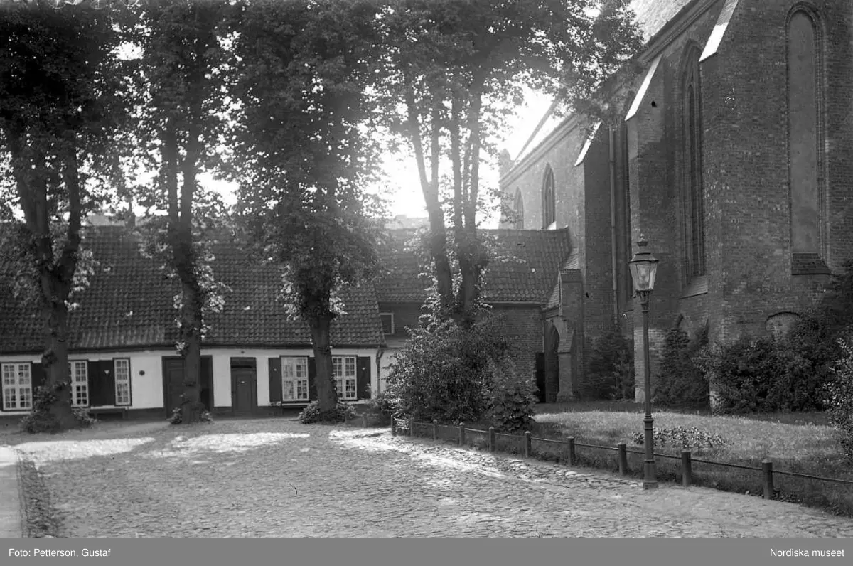 Vy från norra Tyskland, Rostock.Klosterkirche. Frigård med kloster, byggnader i fonden.
