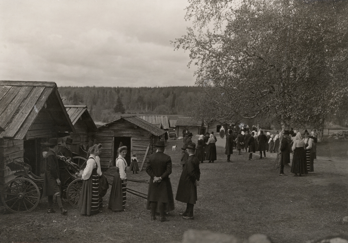Högtidsklädda människor samlade utanför kyrkstallarna vid Rättviks kyrka i Dalarna