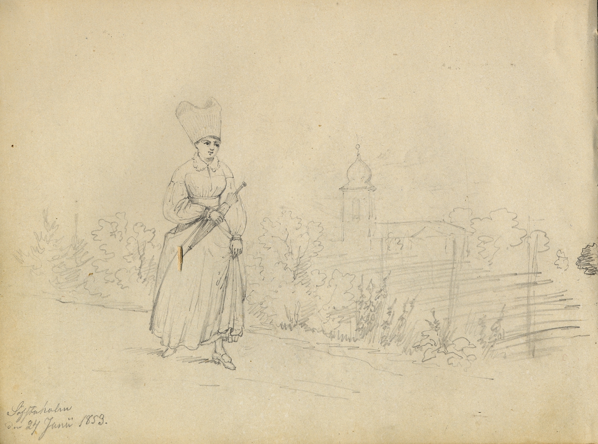 Blyertsskiss. Kvinna framför en kyrkobyggnad. "Säfstaholm 1859". Ur skissbok märkt G.V Palm, Nordiska museets arkiv.