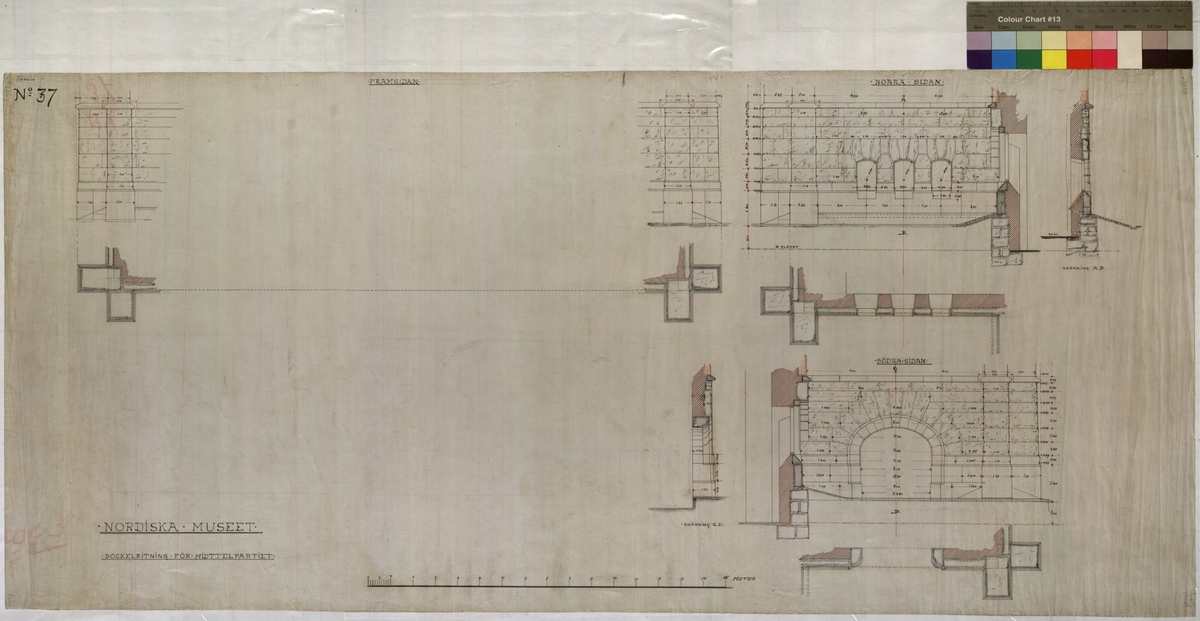 No 37. Nordiska Museet. Sockelritning för midtelpartiet. Framsidan Norra sidan. Södra sidan.