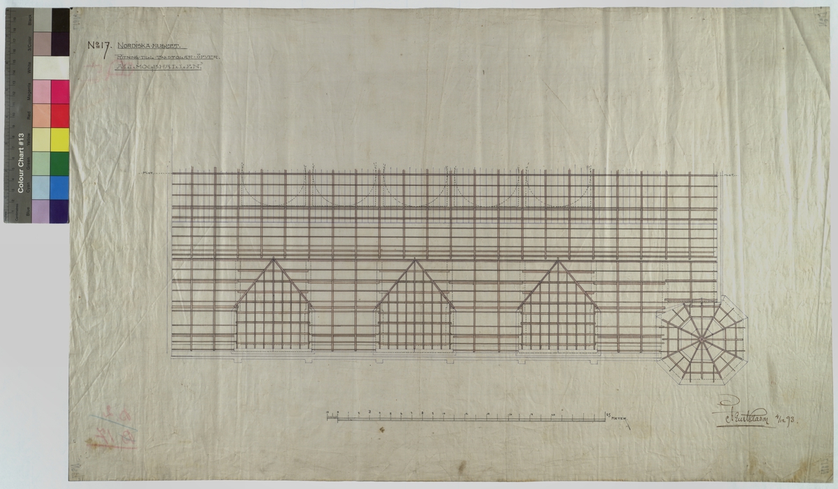 No 17 Nordiska museet. Ritning till takstolarna öfver allmogehallen.