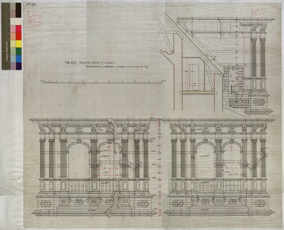 No 145. Nordiska Museet. Midelpartiets trapptorn. (Utdrag ur ritning no 159)
