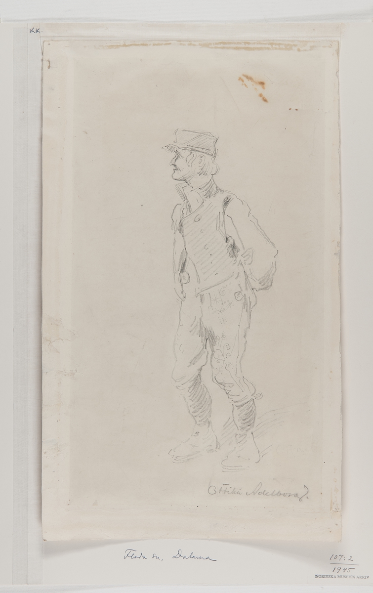 Handteckning av Ottilia Adelborg. Mansdräkt från Floda, Dalarna.