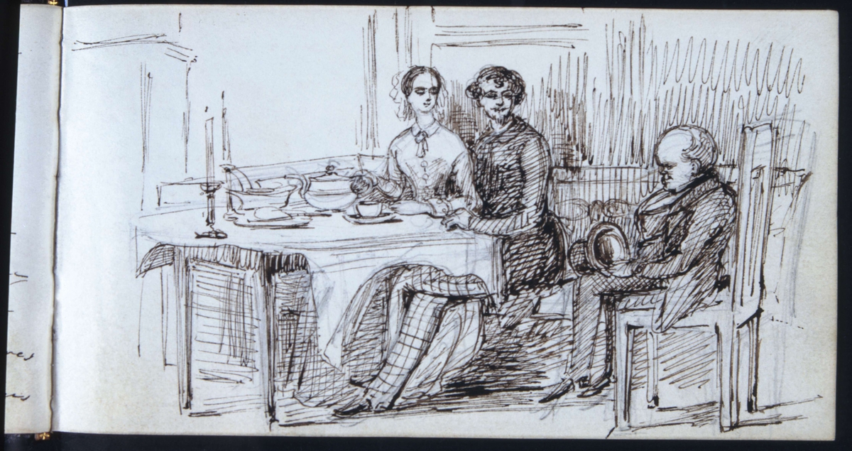 "Bröllopsresan. Brudparet vid frukost ". Tuschteckning av Fritz von Dardel