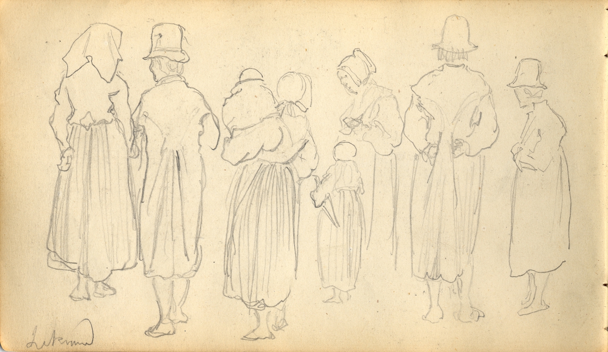 Många dräktklädda människor, Leksand. Ur J.A Malmströms skissböcker.