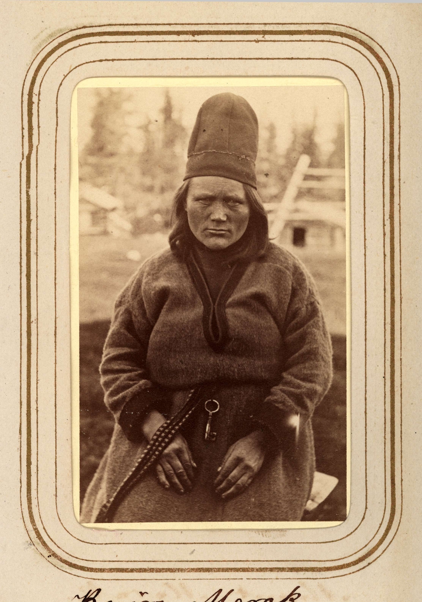 Porträtt av Karin Merak, 28 år gammal, Sjokksjokk. Ur Lotten von Dübens fotoalbum med motiv från den etnologiska expedition till Lappland som leddes av hennes make Gustaf von Düben 1868.