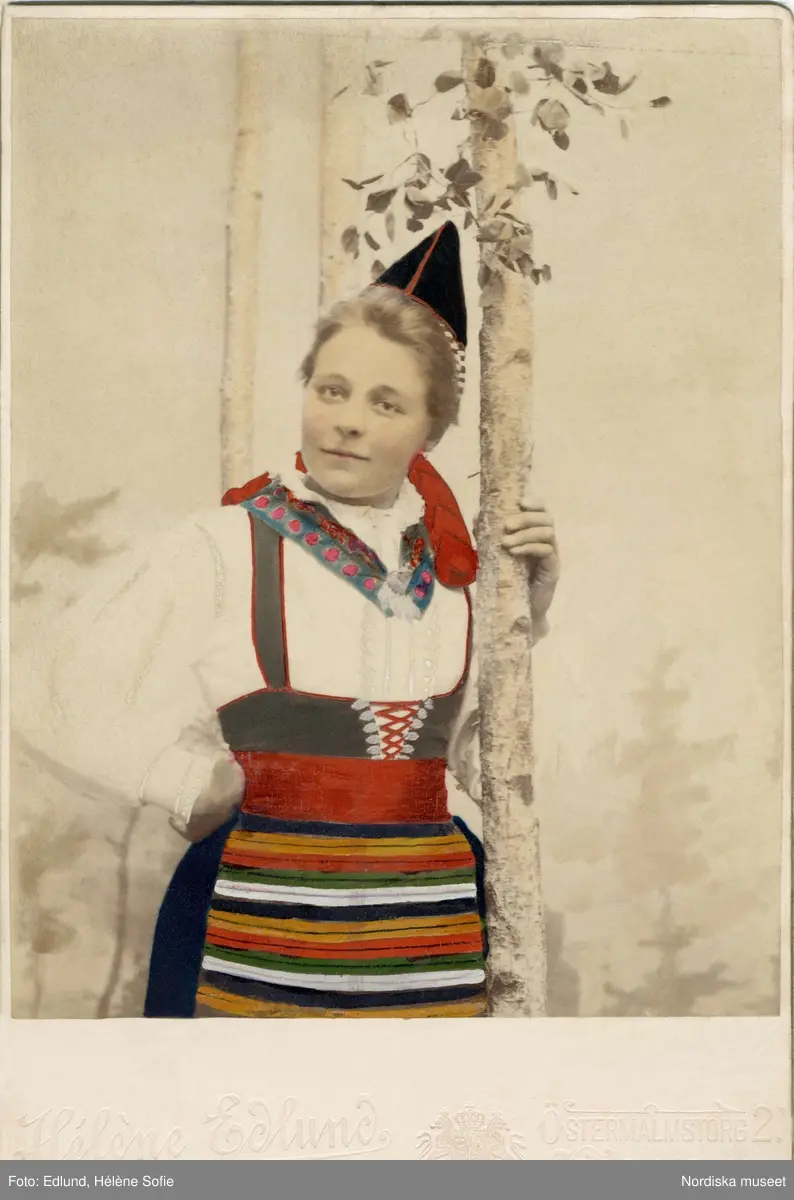 Kvinna poserar i en folkdräkt från Dalarna, lutande sig mot en trädstam. Handkolorerat ateljéporträtt.