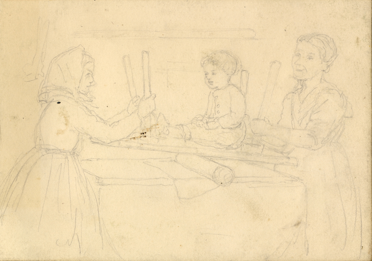 Blyertsskiss. Två kvinnor manglar. Ett litet barn sitter på mangelbrädan mellan dem. Ur Skissbok av A. J.G. Virgin