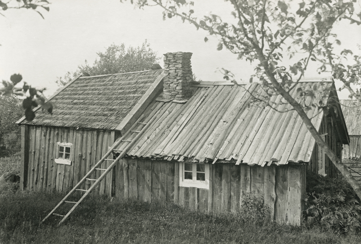 Granet, Hinneryds socken, Småland. Loftstuga från täppan. Stugans lägre del är täckt med brädor och s k bakar (ytor eller utrännare). Den högre delen är täckt med spån. Troligen har även den lägre delen tidigare varit spåntäckt, men taket har förmodligen tätats med spillvirket från en såg när spånorna tjänat ut.