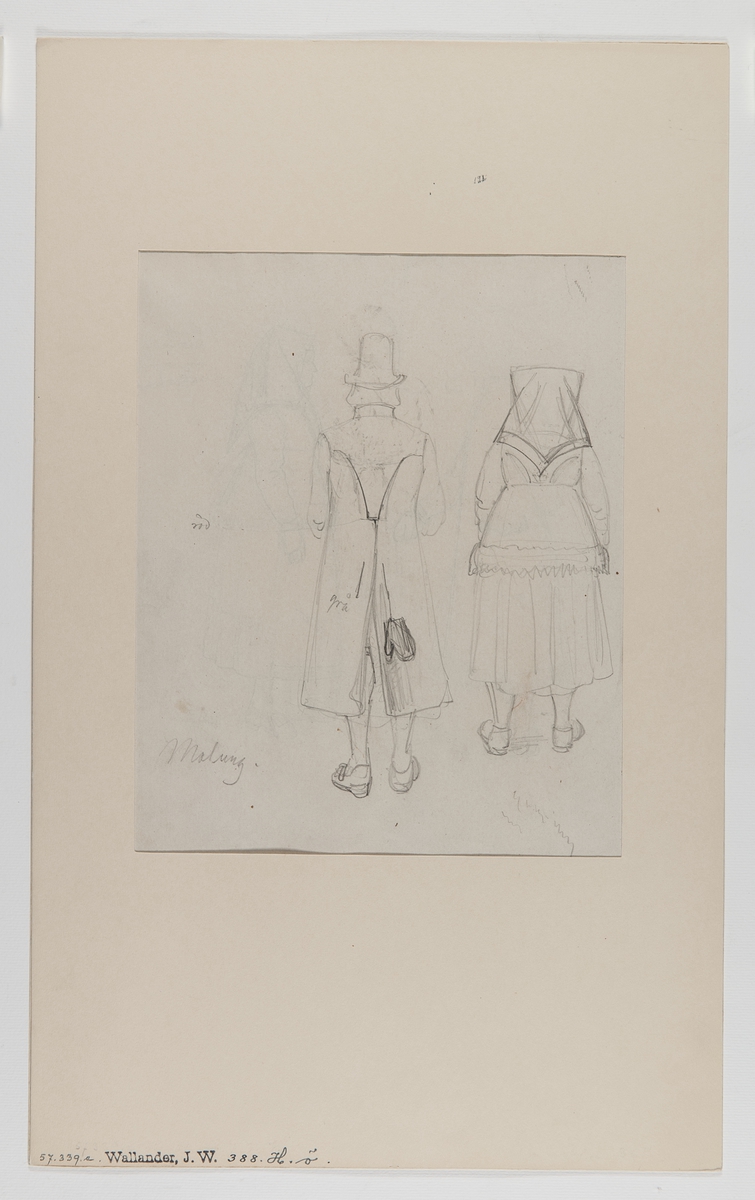 Handteckning av J W Wallander. Mans- och kvinnodräkter från Malung, Dalarna. Nordiska museets inventarienummer 57339e.