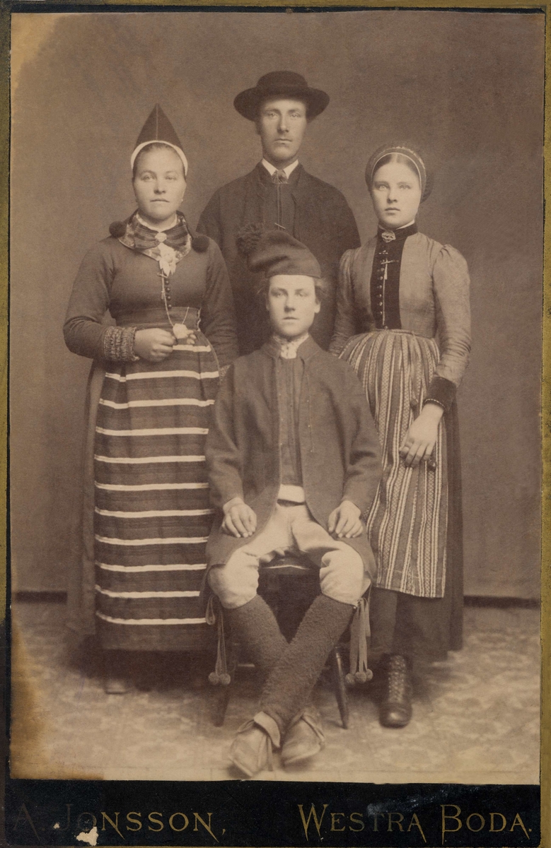 En familj poserar klädda i dräkter från Rättvik, Dalarna.
