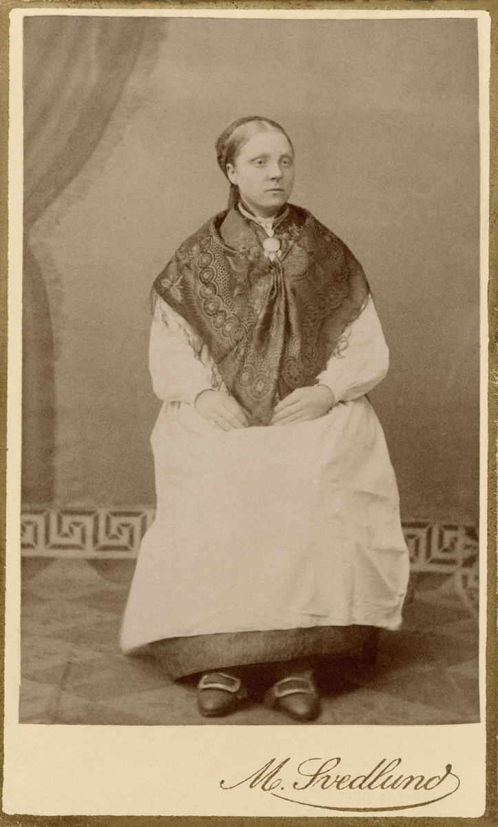 "Härjedalsk förstje flickdrägt från 1800 - talets början". Halsklädet är från 1800-talets mitt