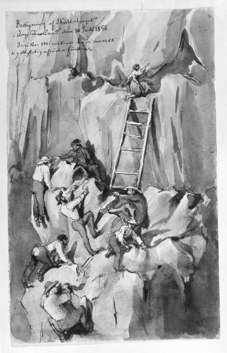 Sepialavering av Fritz von Dardel. "Bestigning af Skule-berget i Ångermanland den 30 Juli 1858".