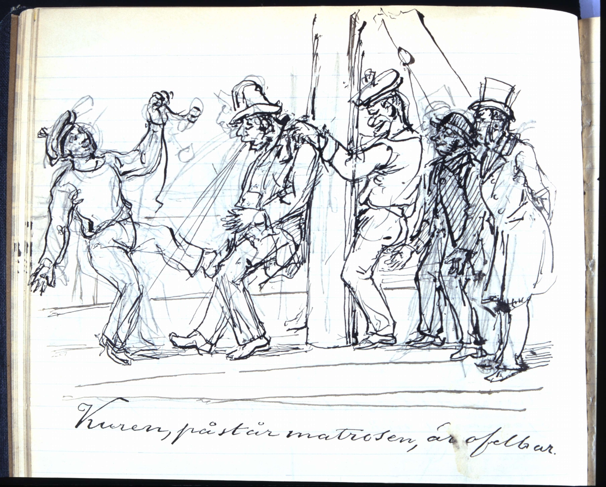 Titel: Sjösjuka. "Kuren, påstår matrosen , är ofelbar" . Tuschteckning av Fritz von Dardel.