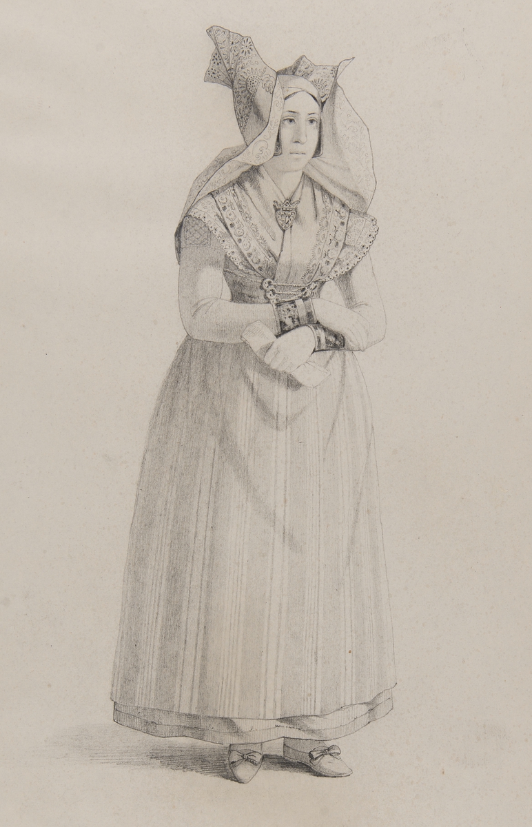 Dräkt. "Johanna Anders Dotter Från Trälleborg, Skytts härad" Blyertsteckning av kvinna i dräkt i storformat av Otto Wallgren Trelleborg.