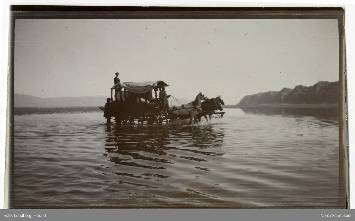 Persien. En hästdragen vagn korsar ett vattendrag. Berg i bakgrunden.