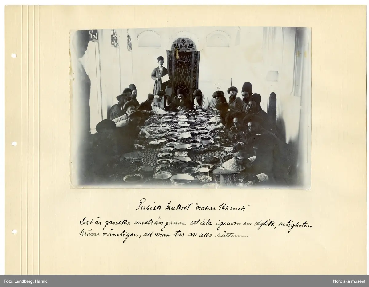 "Persisk frukost, 'Nahar Khaneh'. Det är ganska ansträngande att äta igenom en dylik, artigheten kräver nämligen, att man tar av alla rätterna." Sida ur fotoalbum.