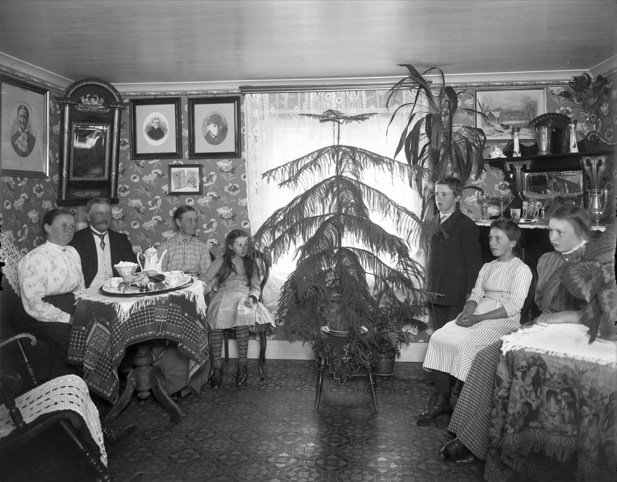 Interiör, med sju personer. Gruvfogde Sven Engström med hustrun Maria, samt en kvinna och fyra barn. Framför fönstret står en stor rumsgran. Taberg. Värmland. Färnebo hd. Nordmarks sn. Finnmarken.