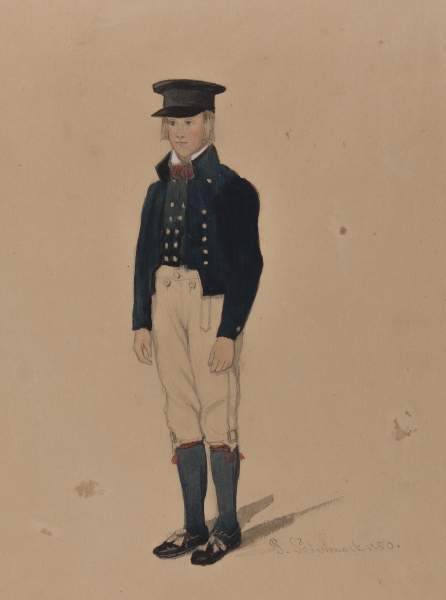 Pojke i dräkt. Akvarell av P Södermark 1850.