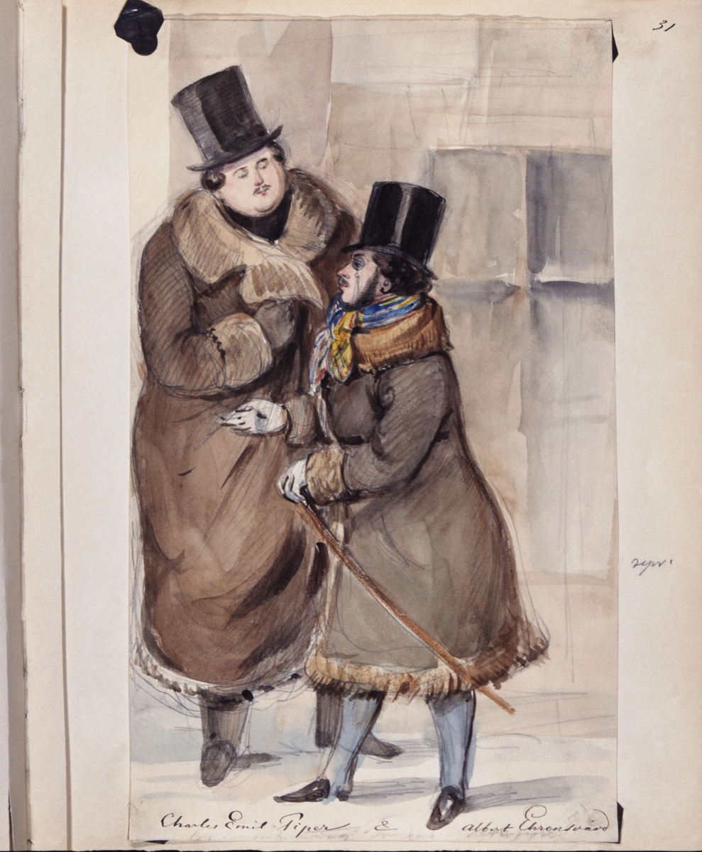 Två män, Charles Emil Piper och Albert Ehrensvärd, i vinterrockar och höga hattar står och samtalar. Akvarell av Fritz von Dardel, trol. 1840-tal.