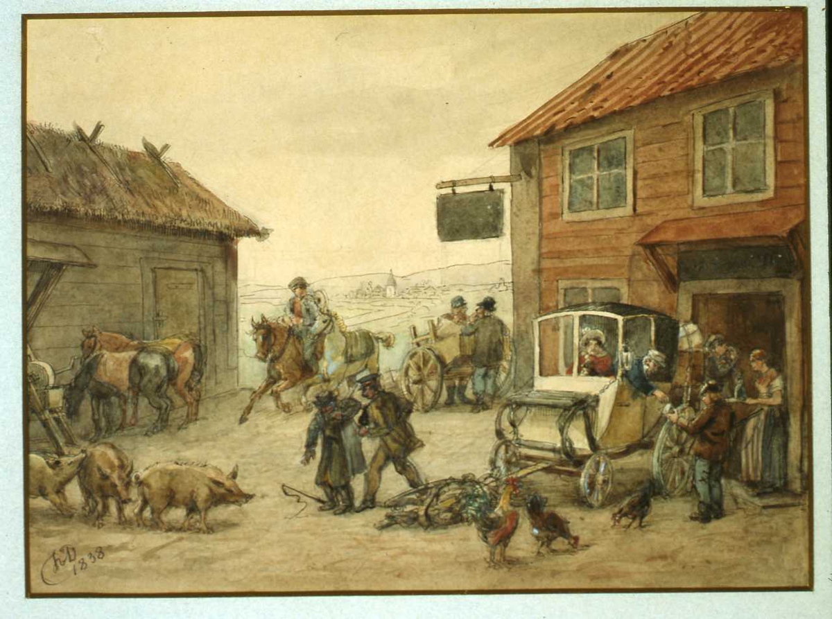 Akvarell av Fritz von Dardel, 1838. En skjutsbonde blir utskälld (av hållkarlen?) och en kommer med sina hästar.