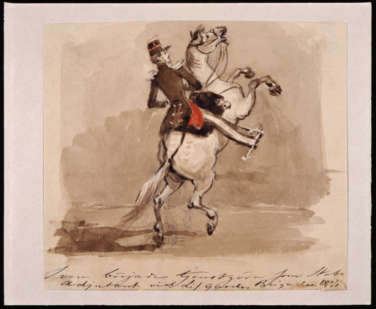 "Sven började tjenstgöra som stabsadjutant vid lifgardes Brigaden 184?". Kavallerist på stegrande häst. Akvarell av Fritz von Dardel.