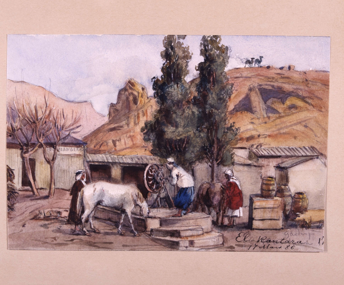 El Kantara 17 mars 1886". Algeriet. Några män vevar upp vatten till sina hästar. Akvarell av Fritz von Dardel, 1886