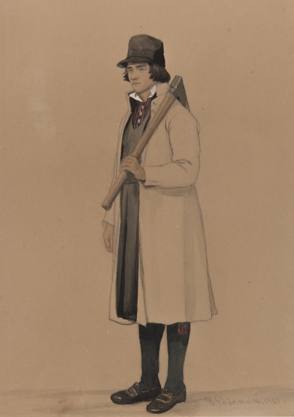 "Dalarna, Nås sn" Man i vit rock med yxa. Akvarell P. Södermark 1850.