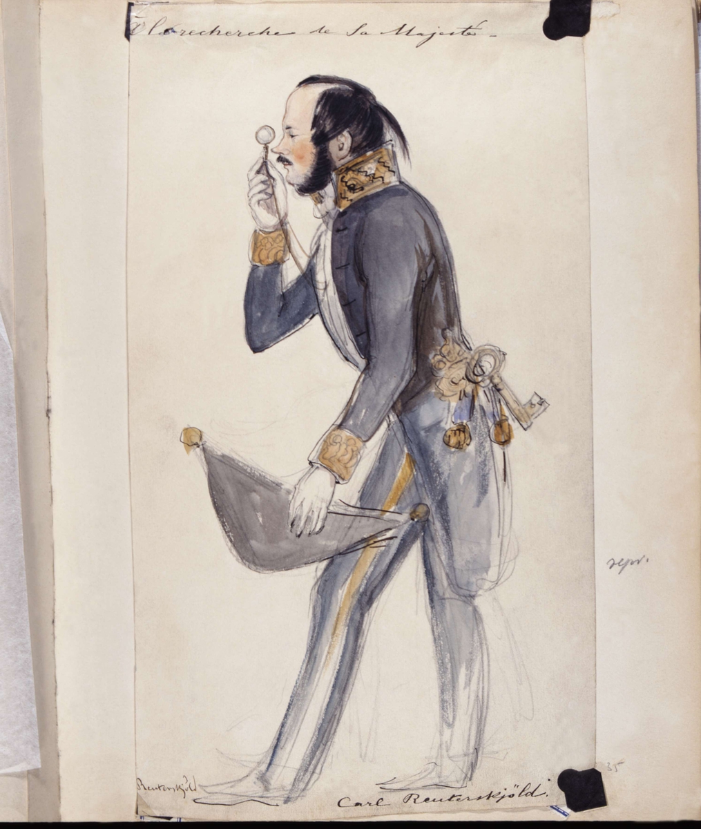 "Á la recherche de Sa Majesté". (Otydligt i originalet). Carl Reuterskjöld i uniform med monokel. Akvarell av Fritz von Dardel.