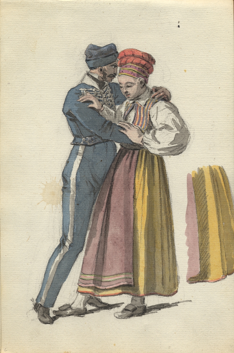 Akvarell. Dräktskiss. Dansande par. En man i uniformslik dräkt med armen om midjan på en kvinna i folkdräkt. Båda i helfigur. Detaljskiss av kjolen. Skiss ur skissbok ur Johan Gustaf Sandbergs arkiv, Nordiska museet INV.NR: NM.0080508.
