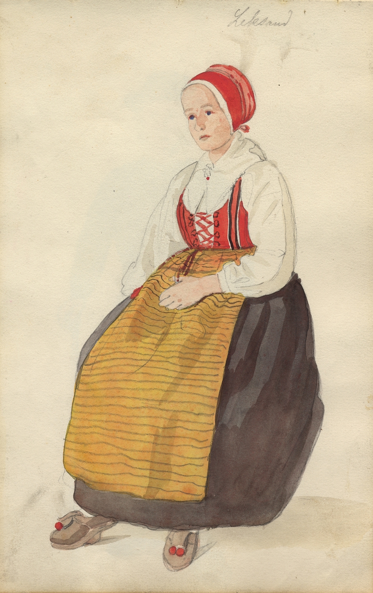 Akvarell. "Leksand" Kvinna i dräkt, sittande i helfigur. Ur Skissbok av A. J.G. Virgin