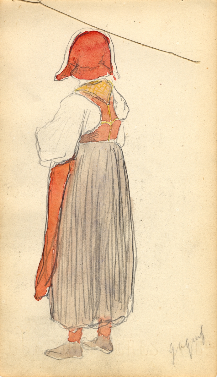 Akvarell. Flicka i dräkt med ryggen mot betraktaren. Gagnef. Ur J.A Malmströms skissböcker.