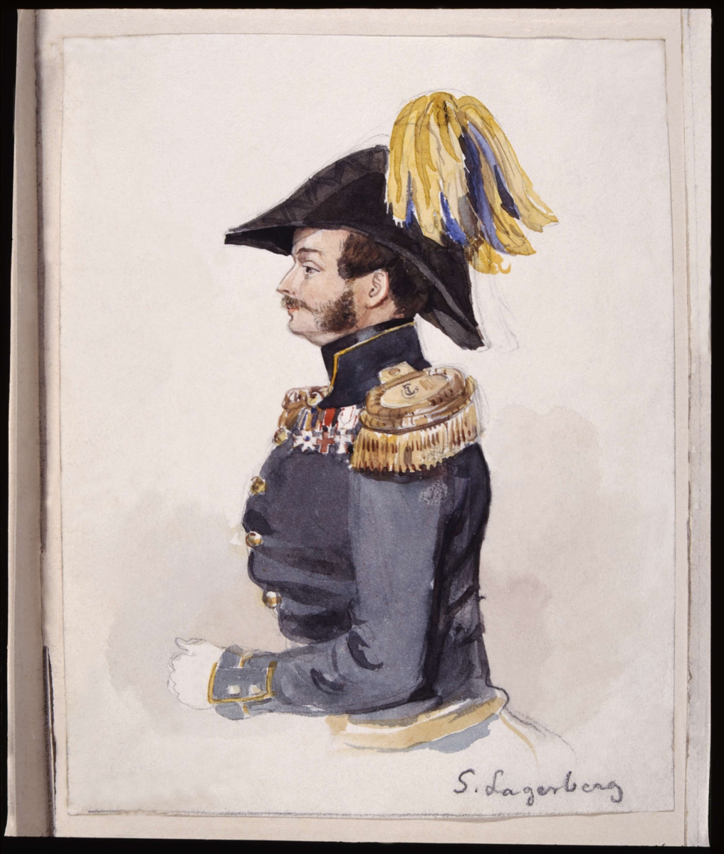 Porträtt av Sven Lagerberg (1822-1905) i profil klädd i högtidsuniform. Akvarell av Fritz von Dardel.