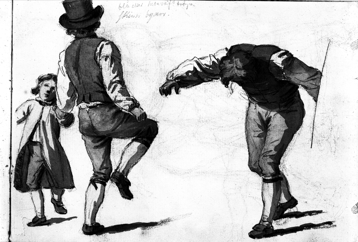 Akvarell. Män i folkdräkt dansar "Vingåkersdans". Ur J.G. Sandbergs skissbok, Nordiska museets föremål inv.nr 80508.