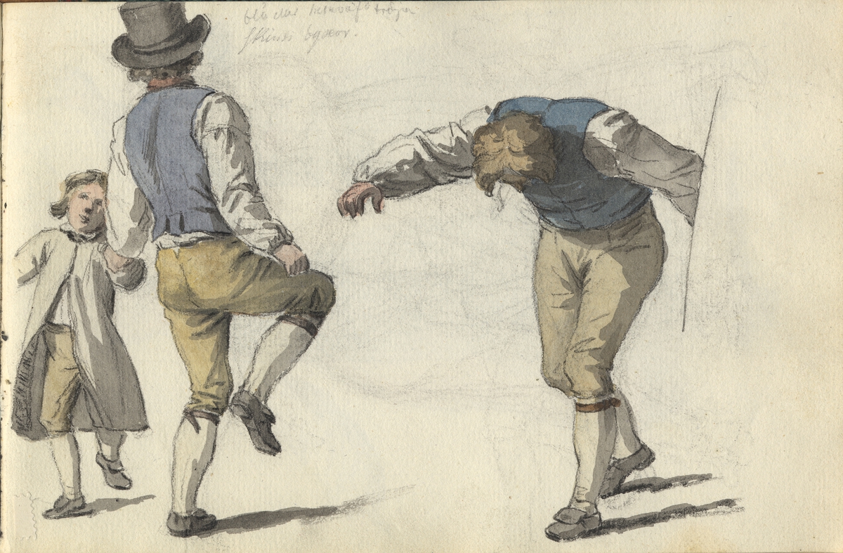 Akvarell. Dräktskiss, mansdräkt. Tre män i folkdräkt. Två dansar. Akarell ur skissbok ur Johan Gustaf Sandbergs arkiv, Nordiska museet INV.NR: NM.0080508.