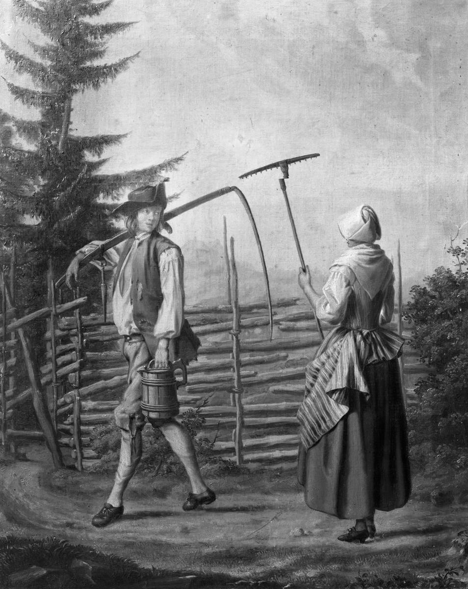 Man och kvinna, dräng och piga, klädda i folkdräkt i landskap vid gärdesgård. Kvinnan håller en kratta, mannen en lie och bär ett laggat kärl i den andra handen. Foto av målning utförd av Pehr Hilleström.