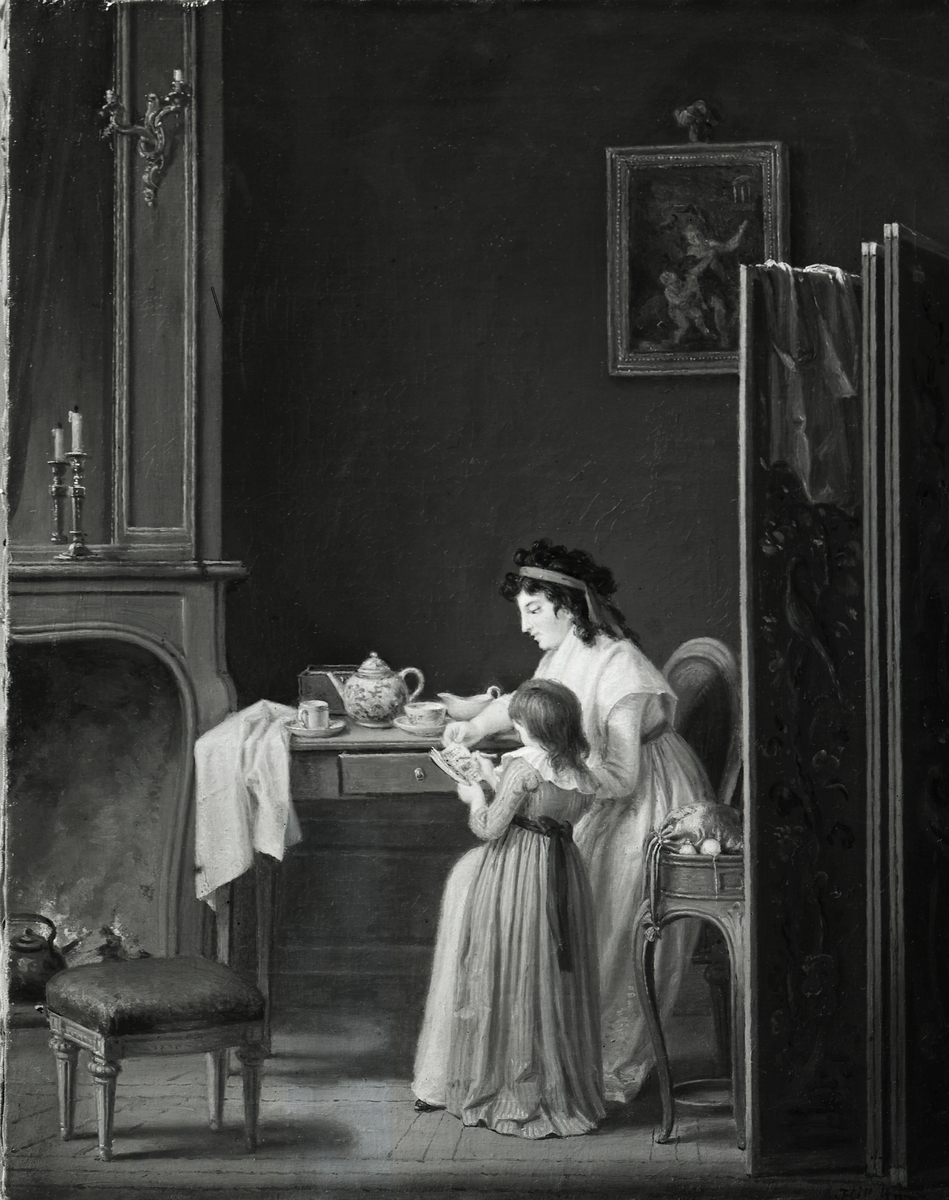 En liten flicka undervisas i läsning av en kvinna. Interiör med öppen spis, rumsavdelare, skrivbord och taburett. Reprofotografi av målning av Pehr Hilleström.