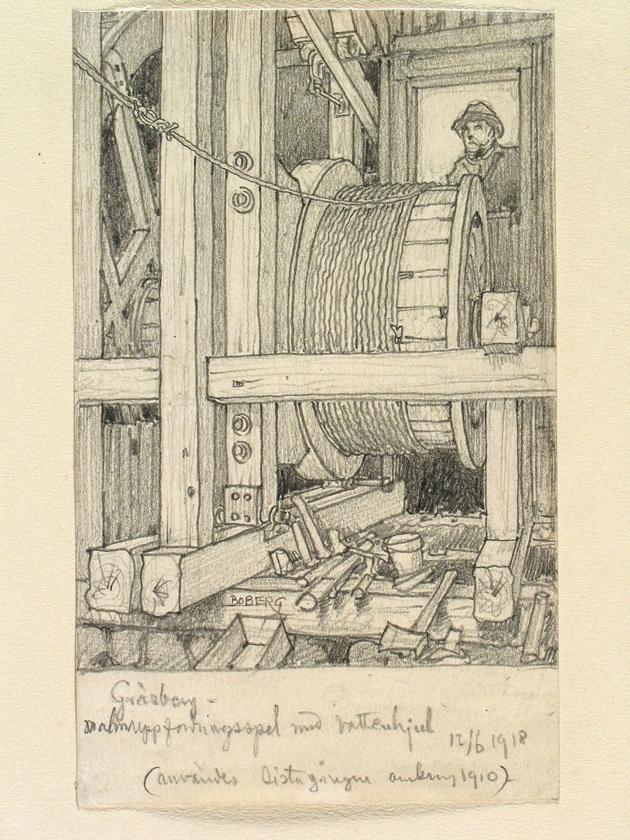 Teckning av Ferdinand Boberg. Dalarna, Ludvika socken, Gräsberg. "malm. uppforslingsspel med vattenhjul 12/6 1918. (Användes sista gången omkring 1910)" (ordet forsling något osäkert svårläst)