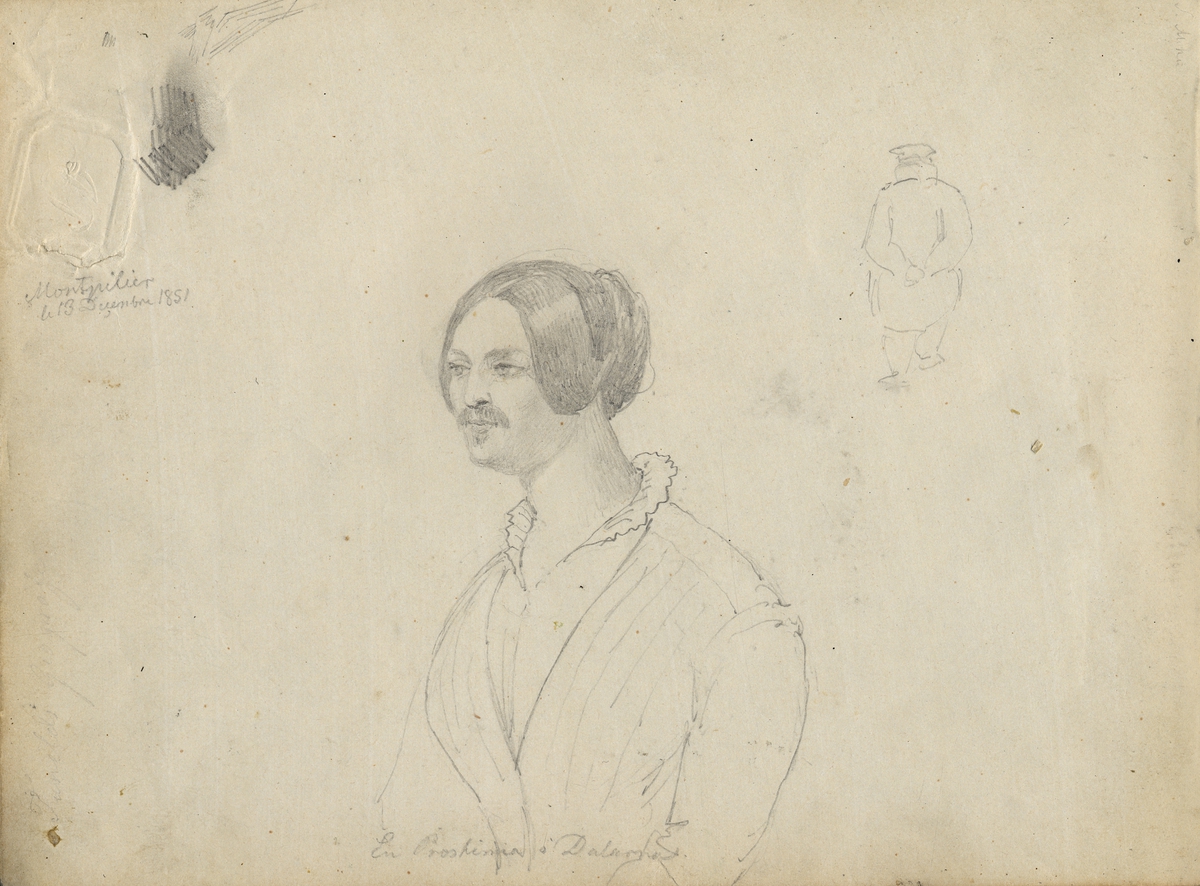 Blyertsskiss. Kvinna (med mustasch och skägg) "En Prostinna i Dalarna". Ur skissbok märkt G.V Palm, Nordiska museets arkiv.