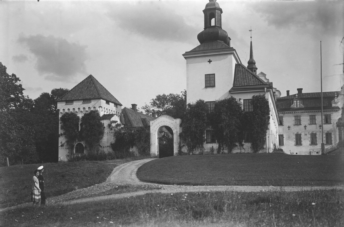 Tyresö slott, exteriörbild från norr med flanerande par i förgrunden