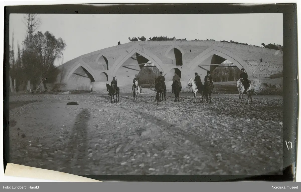 Persien. En grupp män till häst och en hund på en uttorkad flodbädd. I bakgrunden en bro där en kamelkaravan passerar.