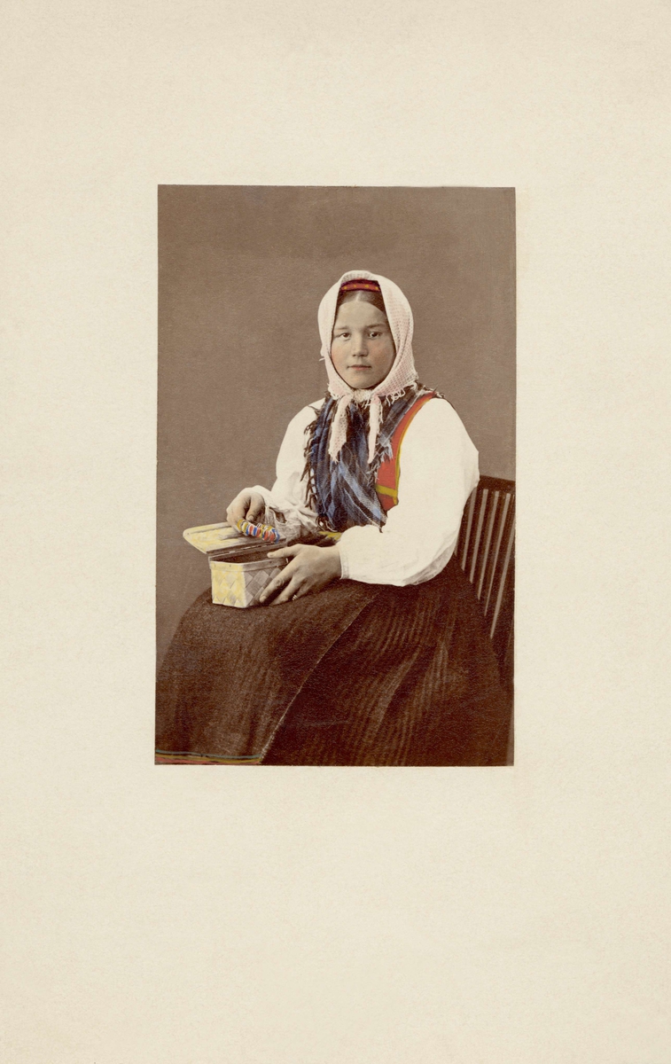Säkert Mora typ. enligt Myr Majt Matsdotter." En flicka sitter på en stol , med en korg i knät