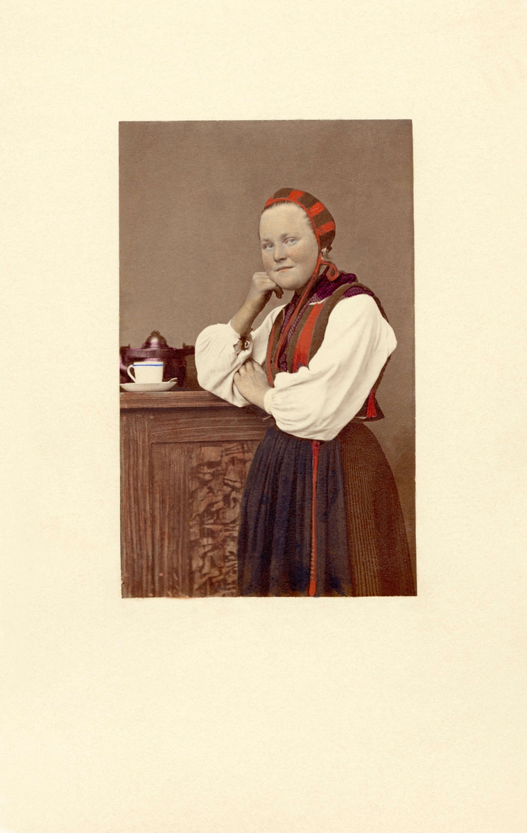 En kvinna står lutad mot en möbel, klädd i en folkdräkt
