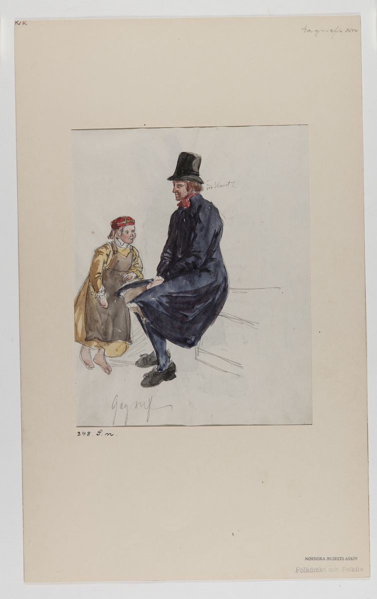 Akvarellerad handteckning. Mans- och pojkdräkt från Gagnef, Dalarna.