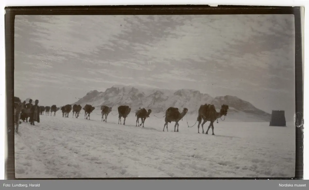 Persien. En kamelkaravan passerar ett snötäckt bergspass.